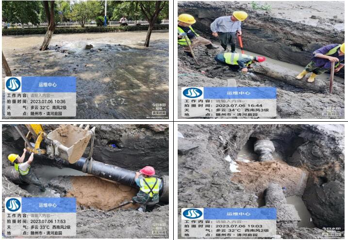7月6日上午10點(diǎn)20分,客服人員接到群眾的熱線電話,告知清河路清河庭院附近路面大量跑水,運(yùn)維中心搶修人員接到消息迅速前往,十五分鐘到達(dá)現(xiàn)場(chǎng),通過(guò)專業(yè)技能和判斷,確定為DN400主管道爆破,測(cè)漏人員立即協(xié)助精準(zhǔn)定位漏點(diǎn),盡量減少開(kāi)挖面,為搶修爭(zhēng)取時(shí)間,該管道會(huì)直接影響周邊黃龍五隊(duì)、清河庭院、東方小區(qū)、楚苑小區(qū)、雙橋家具大市場(chǎng)等小區(qū)和企業(yè)大面積水小或停水。酷暑難耐,為盡快解決群眾用水問(wèn)題,維修人員在35°高溫下連續(xù)奮戰(zhàn)8小時(shí),于當(dāng)晚7點(diǎn)30分恢復(fù)正常供水,及時(shí)避免了周邊居民下班后正常生活用水的問(wèn)題。