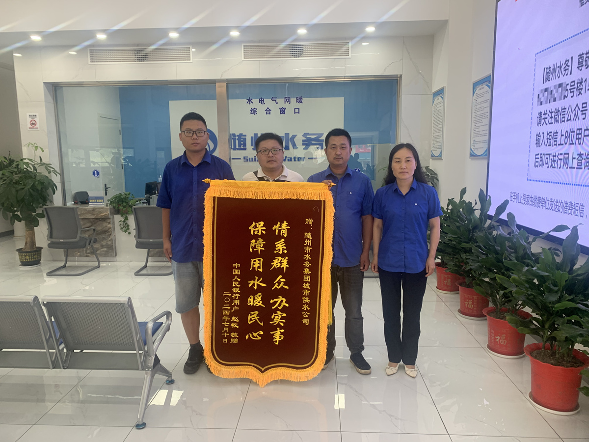 近日,中國(guó)人民銀行用戶將一面繡有“情系群眾辦實(shí)事 保障用水暖民心”的錦旗送到隨州市水務(wù)集團(tuán)城市供水公司共享營(yíng)業(yè)廳。感謝運(yùn)維中心維修人員急用戶之所急、憂用戶之所憂、真心為用戶考慮,解決其用水問題。