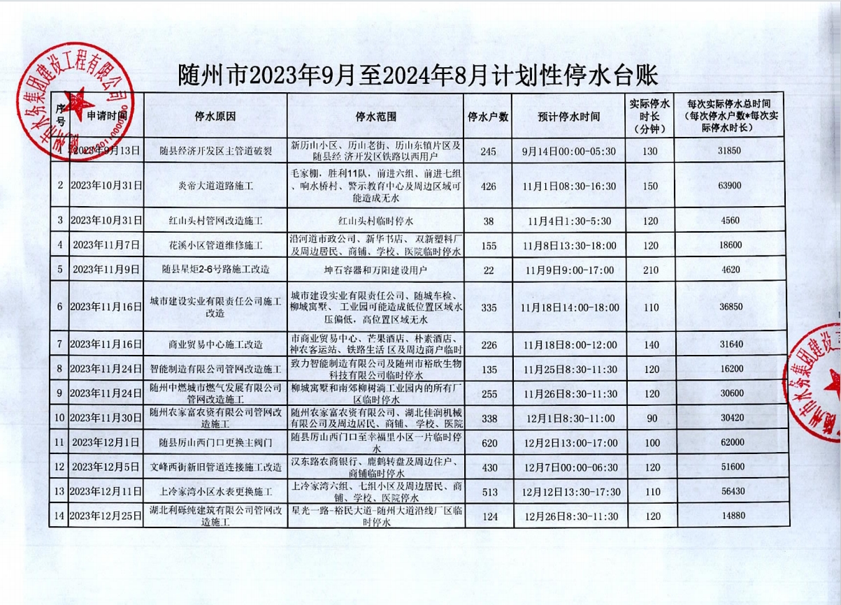 隨州市2023年9月至2024年8月計(jì)劃性停水資料