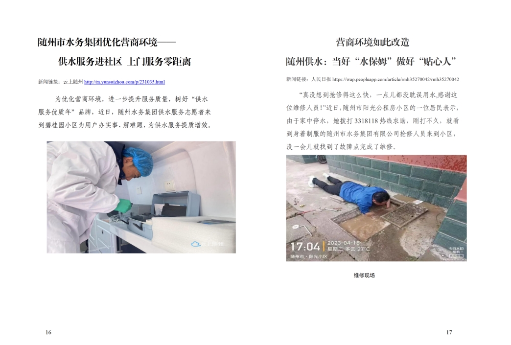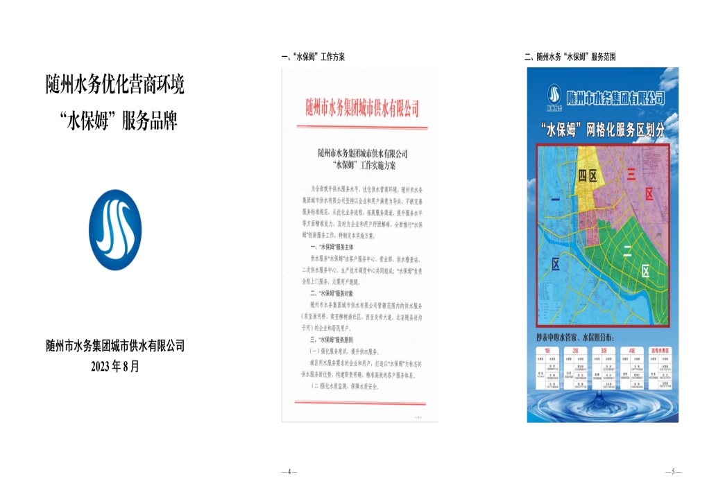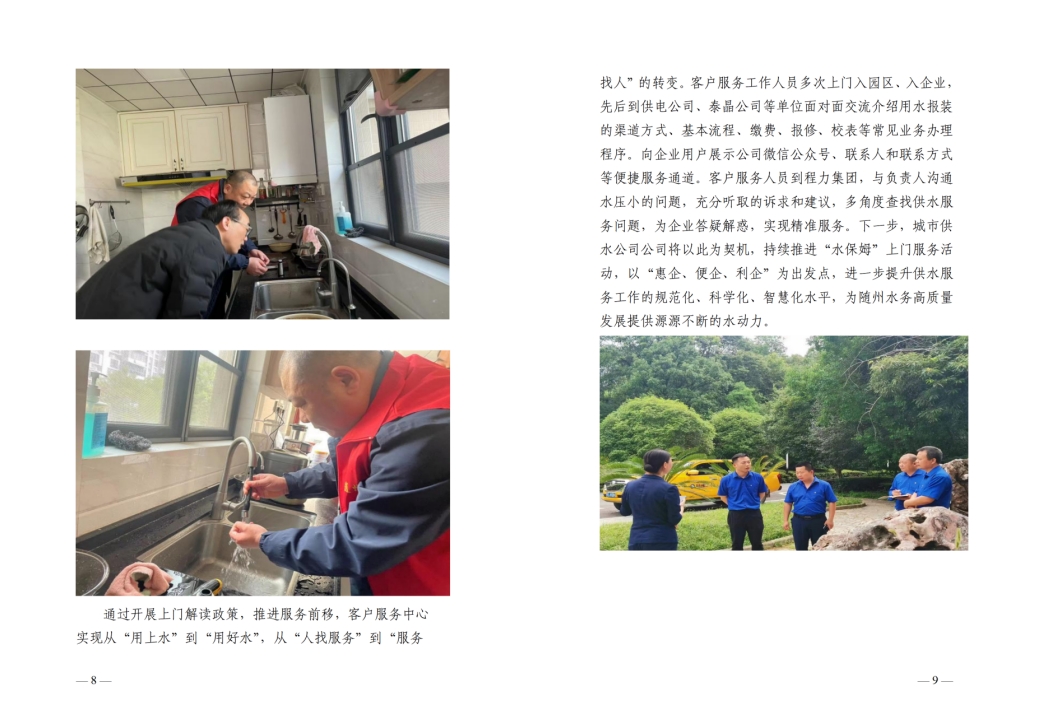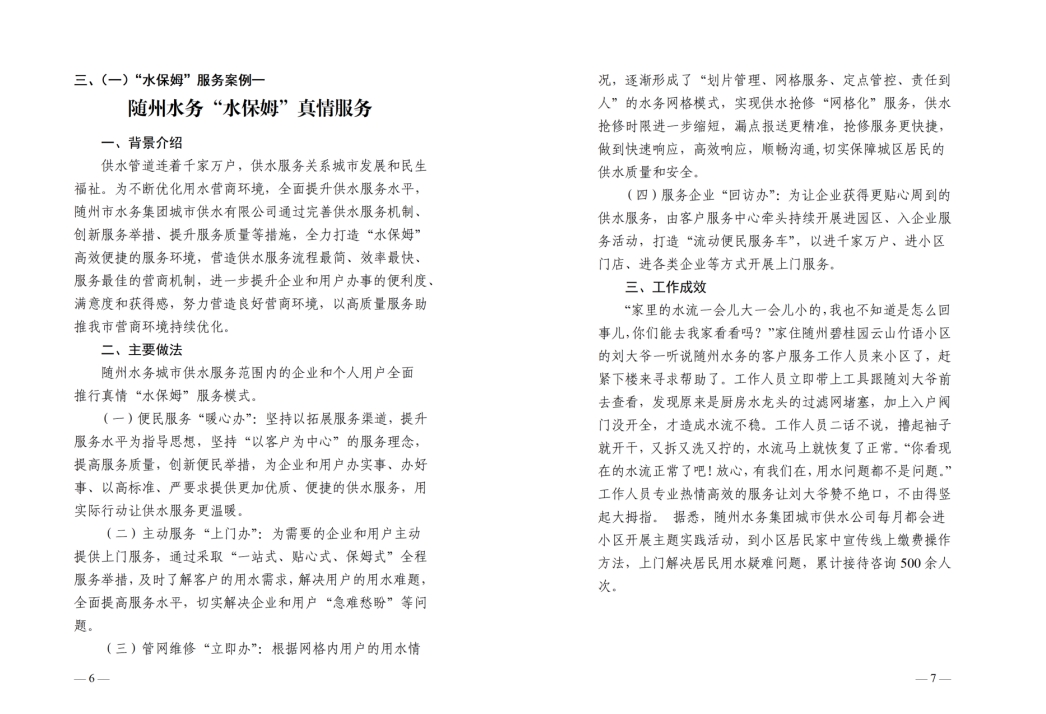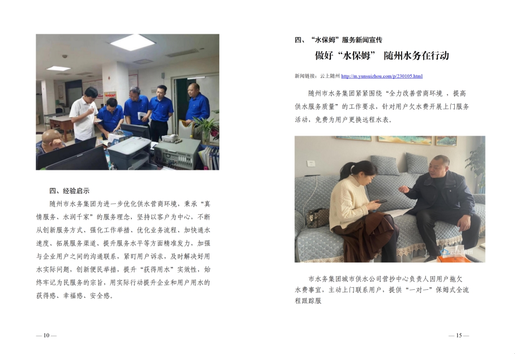 為全面提升供水服務(wù)水平,優(yōu)化供水營商環(huán)境,隨州水務(wù)集團推出“水保姆”供水服務(wù)新模式,建立“供水服務(wù)網(wǎng)格員”隊伍,通過開展清表核查、網(wǎng)格劃分、聯(lián)合社區(qū)共同解決用戶問題等亮點行動,讓百姓暖心,讓企業(yè)放心。
