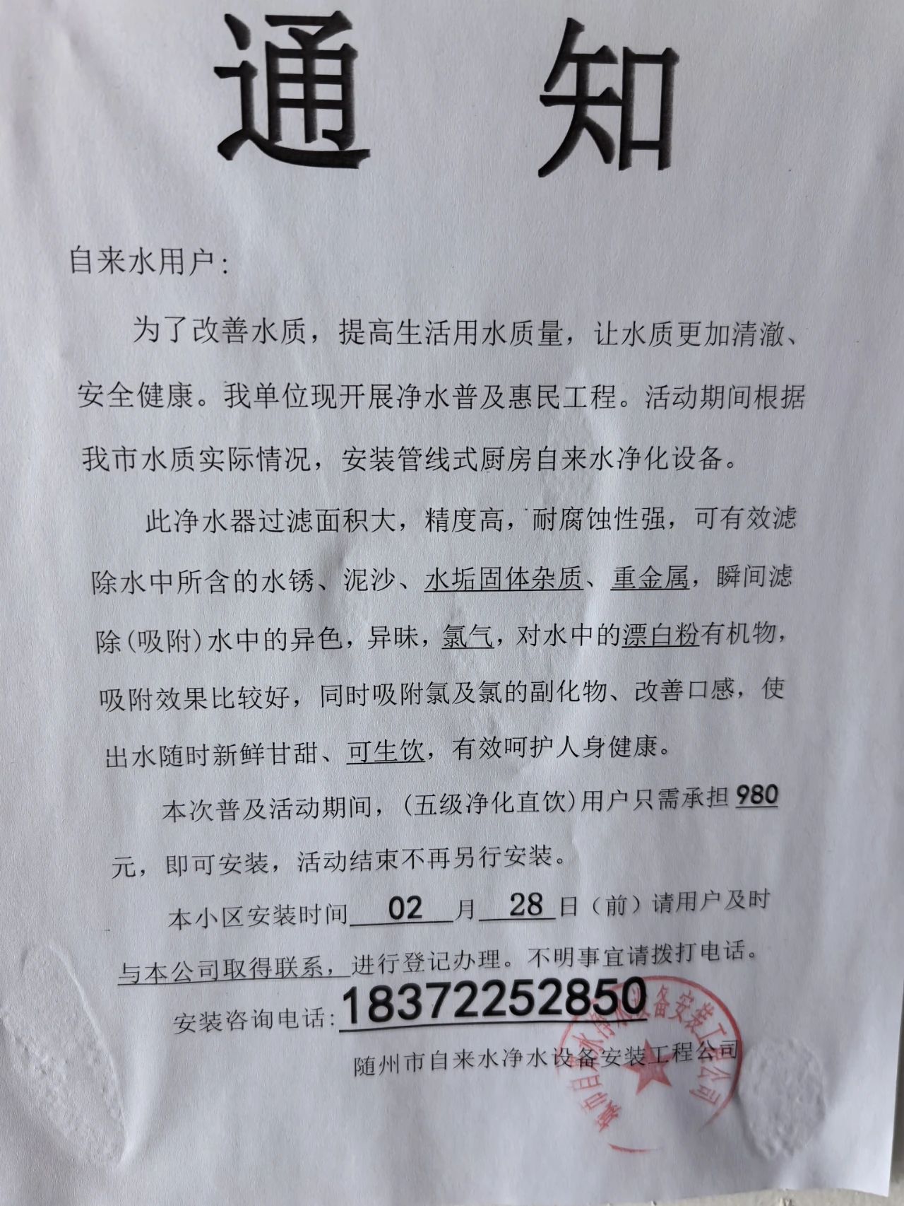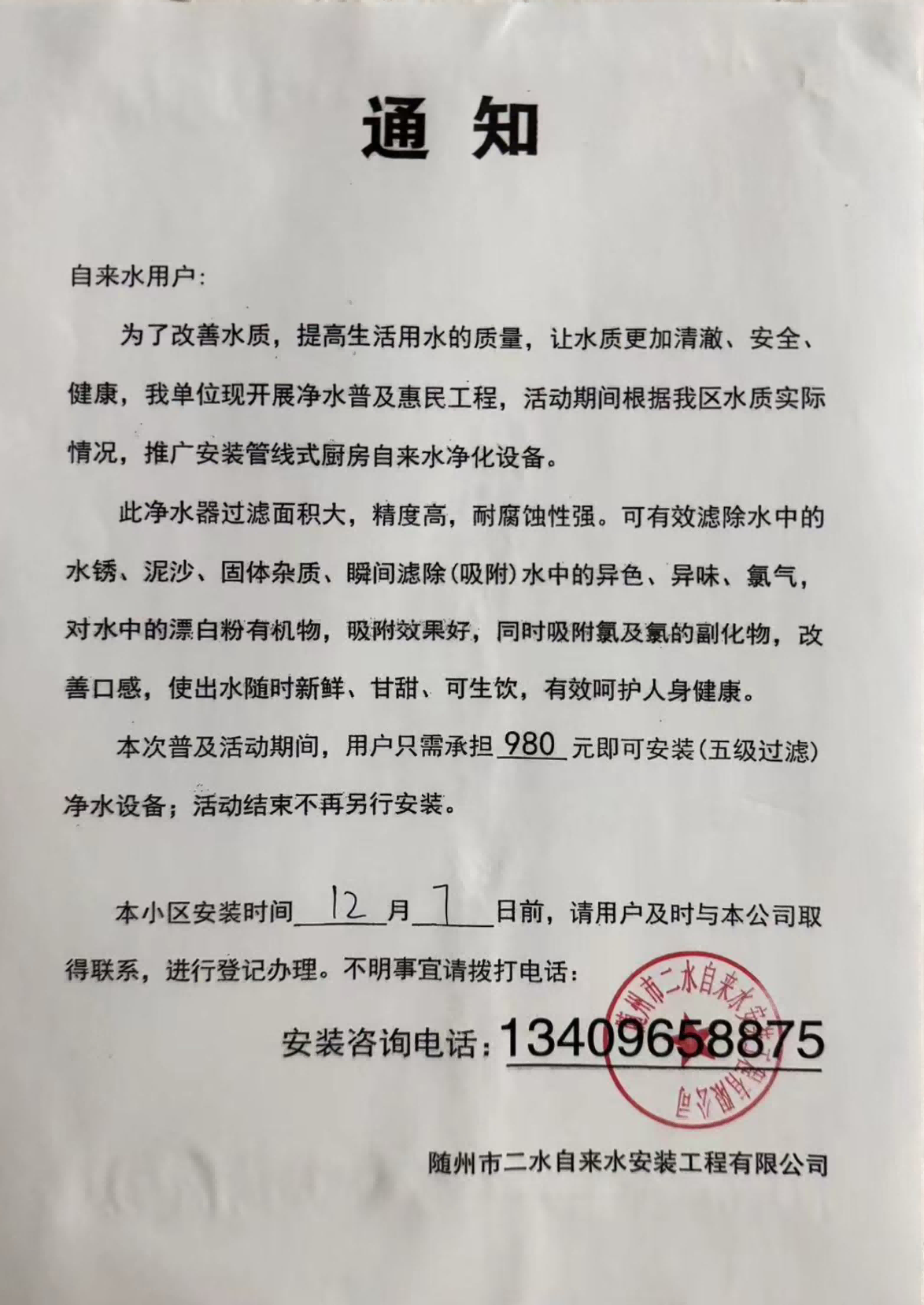 近期,我公司在隨州城區(qū)多個(gè)小區(qū)發(fā)現(xiàn)以“隨州市自來水凈水設(shè)備安裝工程公司”“隨州市二水自來水安裝工程有限公司”等公司名義張貼的《通知》。該行為打著改善自來水水質(zhì)的幌子,誤導(dǎo)自來水用戶,推銷凈水設(shè)備,已造成惡劣影響。現(xiàn)為維護(hù)我公司和廣大市民的合法權(quán)益,特鄭重聲明如下: