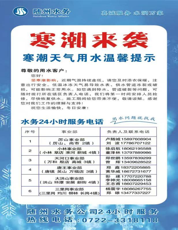 近期,我市持續(xù)遭遇低溫寒潮,嚴(yán)寒天氣對(duì)城鄉(xiāng)供水管網(wǎng)及設(shè)施構(gòu)成嚴(yán)峻挑戰(zhàn),水務(wù)集團(tuán)隨縣供水公司迅速激活應(yīng)急響應(yīng)機(jī)制,提前部署筑防線、精準(zhǔn)服務(wù)解民憂、全員堅(jiān)守保暢通的硬核舉措,切實(shí)保障居民冬季用水無(wú)憂。
